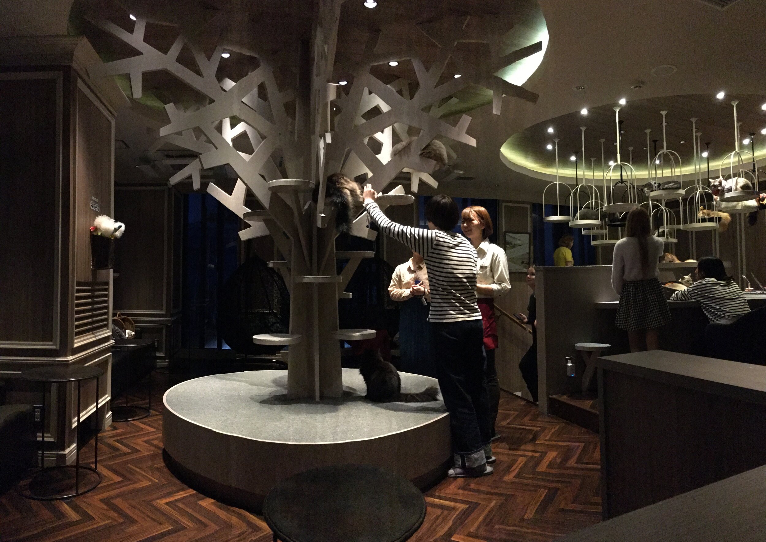 The atmosphere is high class and soothing. They play calming music. The lighting is soft and spot lit. The furniture is all cat friendly but very modern. And the views are incredible! Since you’re looking out the 8th or 9th floor, you can see the beautiful lights of Shibuya, sparkling below you. As the cats leap around from hanging baskets or climb a wooden tree sculpture, you just feel happy. You can pay a little extra to feed the cats treats, or you can just enjoy the cats’ company. They even have toys so that you can play with the cats. No matter what you’re doing there, it’s relaxing and enjoyable.