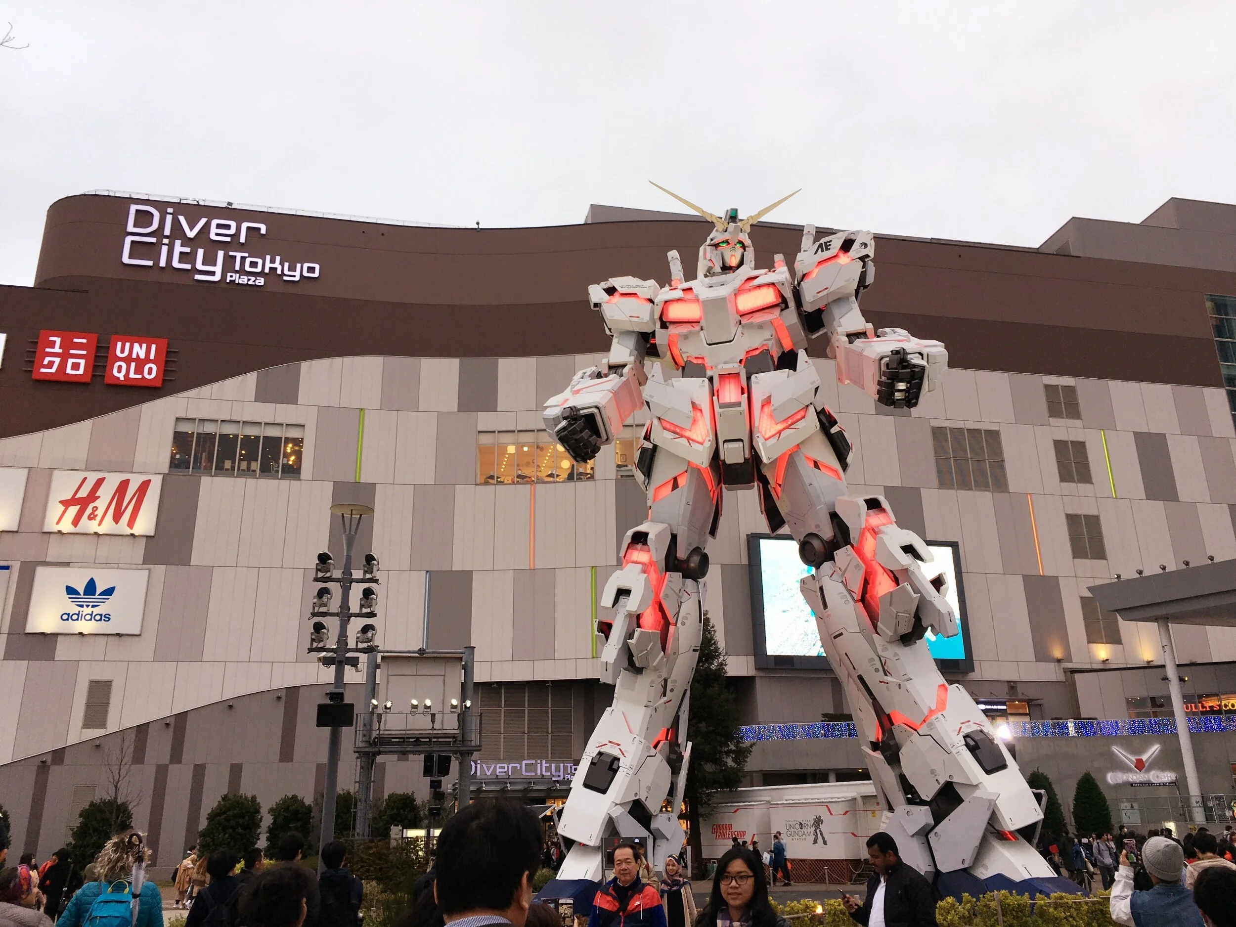 If you're not familiar with gundam, it is a popular science fiction franchise in Japan. There are tons of movies, animes, manga, video games, and merch for these giant fighting robots. The basic idea is that they are robots used to fight, controlled by a pilot in a cockpit inside. That said, they’re supposed to be huge in the stories, for maximum military strength. And this guy is huge! The Odaiba model is almost 65 feet tall! He’s modeled after a gundam from the Mobile Suit Gundam Unicorn series.